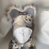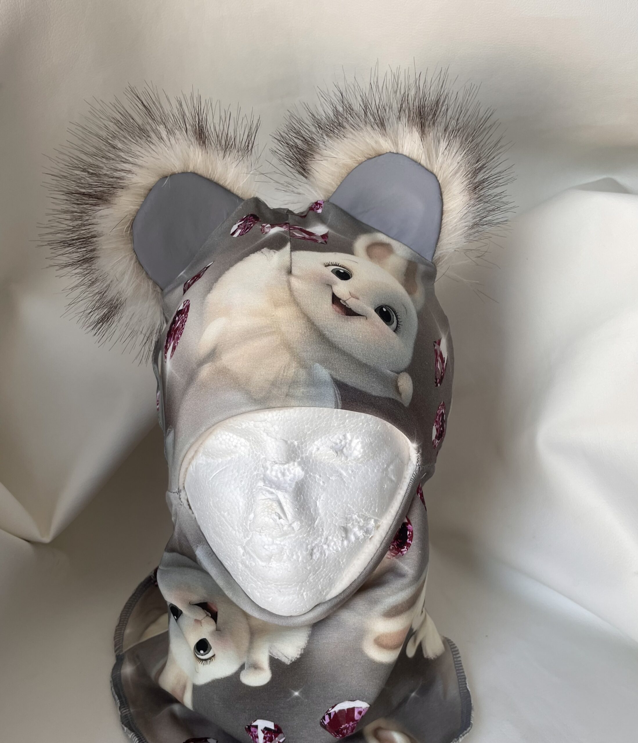 Valgete jäneste ja roosade kristallidega pehme ja mugav fliisiga  müts  on sobib külmadeks talvepäevadeks. Fliisist vooder kaitseb tuule ja külma ees ning hoiab pea ja kõrvad soojas. Tuukrimütsil karvased kõrvad, ees pool pimedas helendav helkur kangas.
