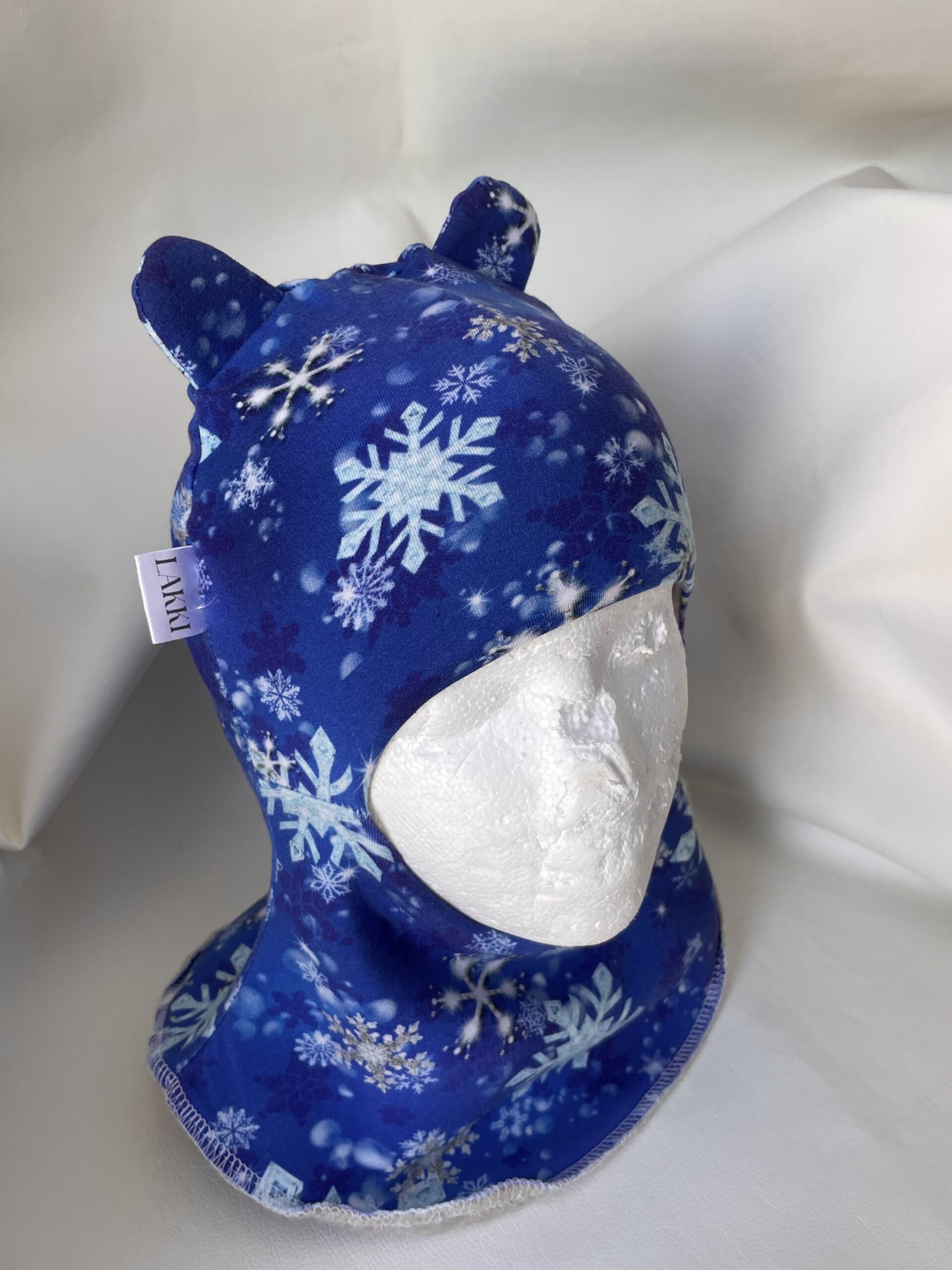 Pehme ja mugav meriinofliisiga  müts  on sobib külmadeks talvepäevadeks. 100% meriinofliis vooder kaitseb tuule ja külma ees ning hoiab pea ja kõrvad soojas. Mütsil pealmine kangas puuvill, tumesinenel põhjal helesininsed ja hõbedased lumehelbed.