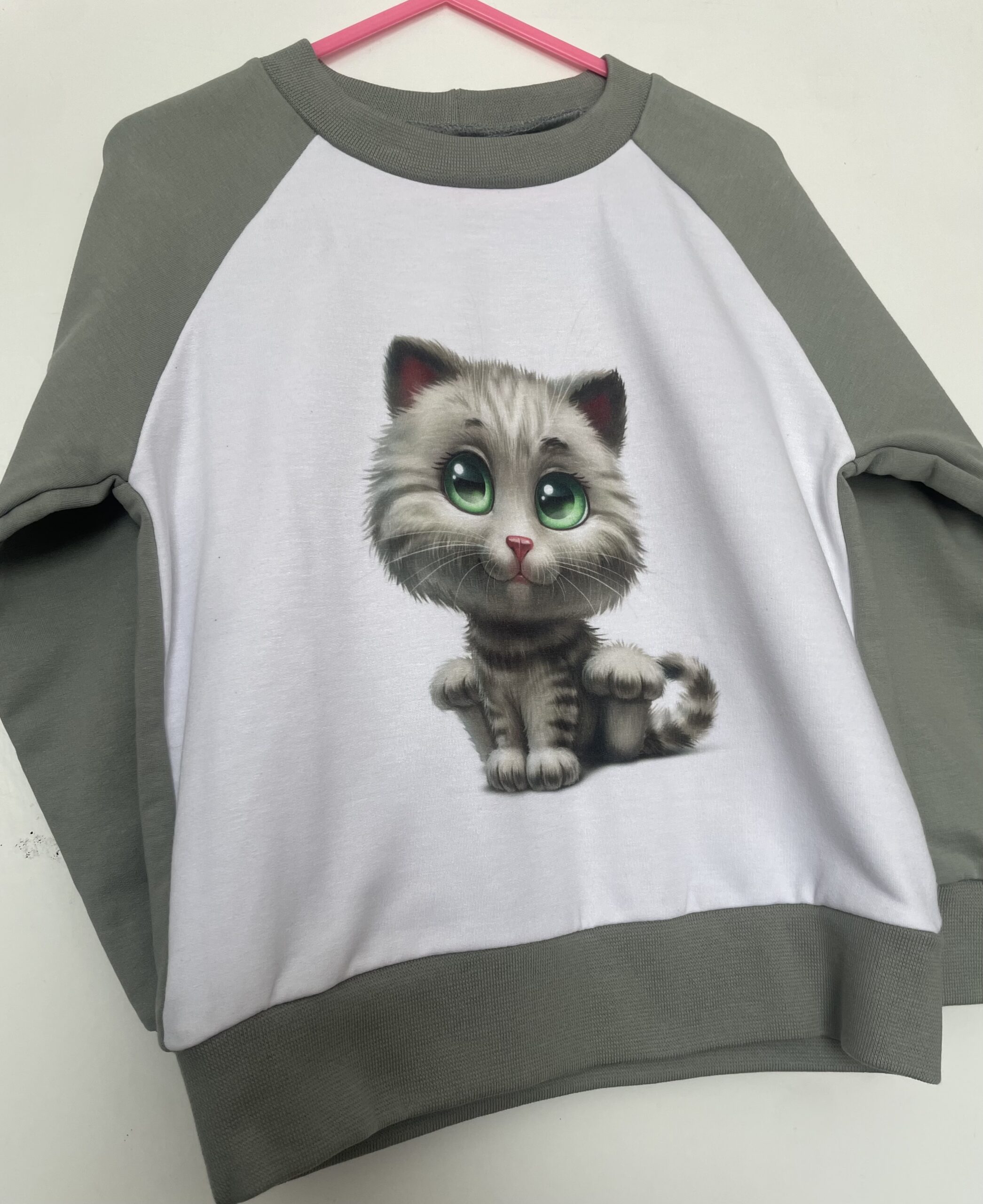 Ees valgel taustal kassi pilt dressikangal, varrukas ja selg uhutud dressikangast.