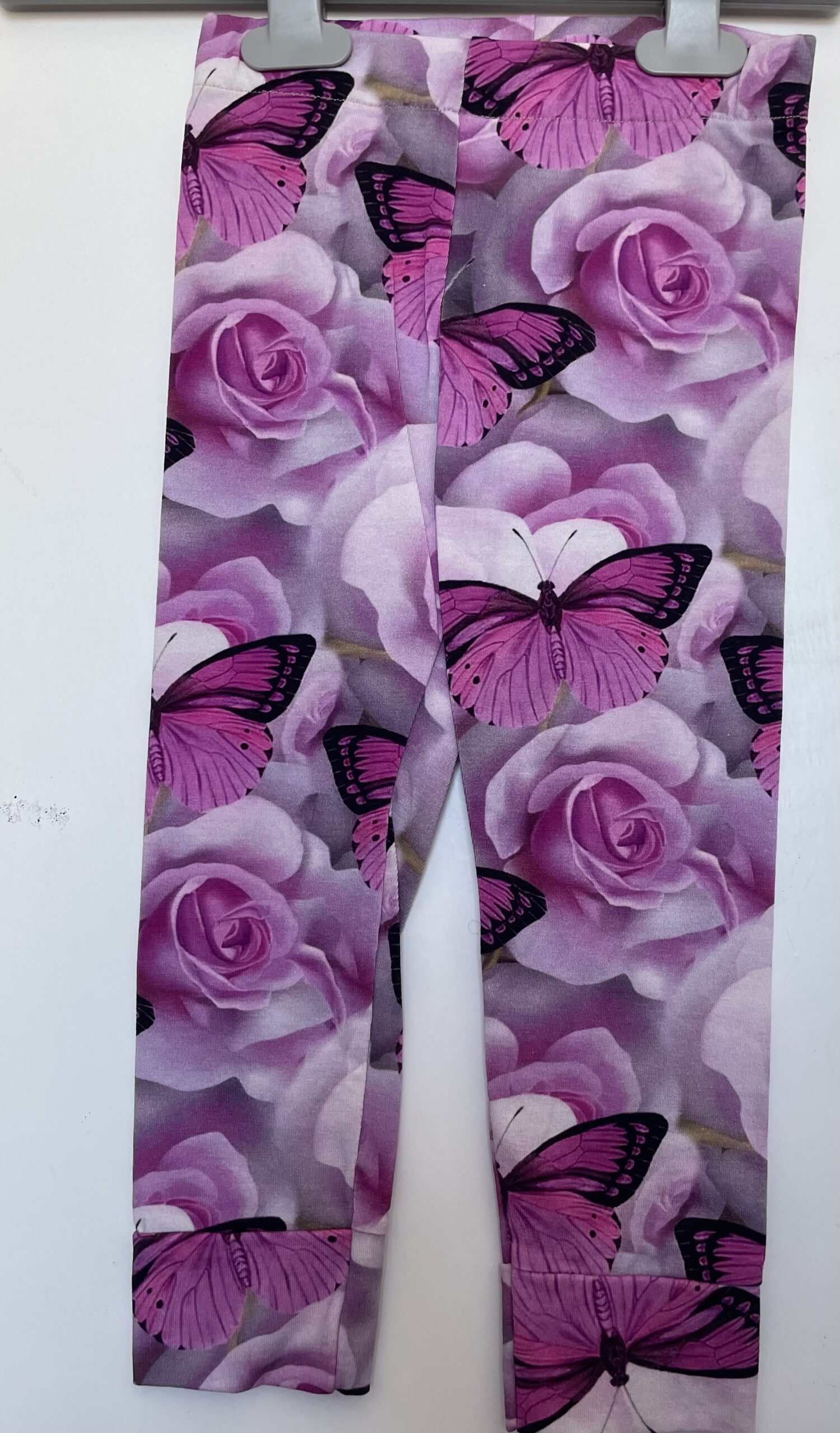 Trikotaaz kangast lillade lillede ja liblikateda retuusid.