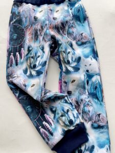 Sinise taustaga huntidega kangas on põlvedel ja tagumikul.